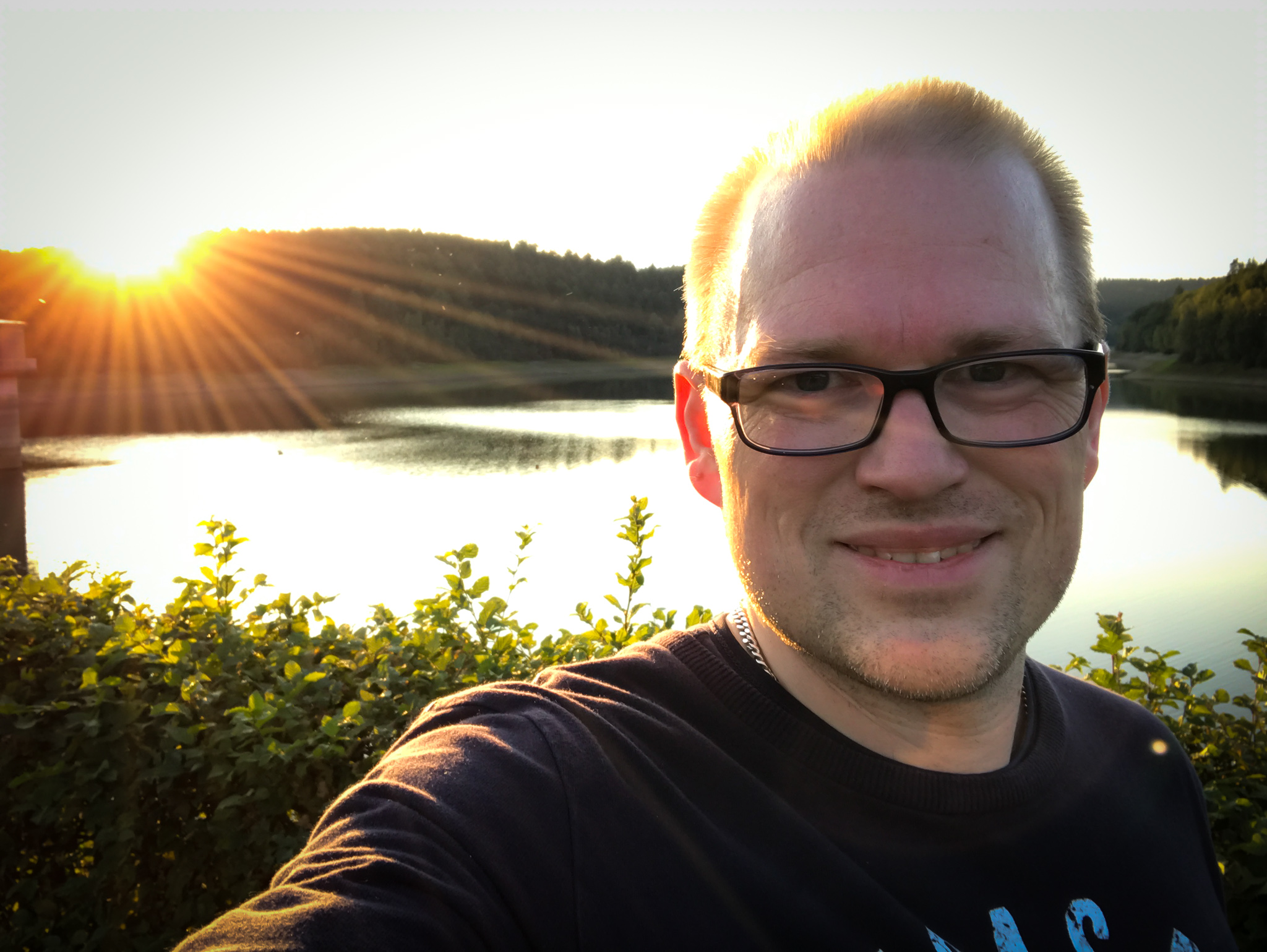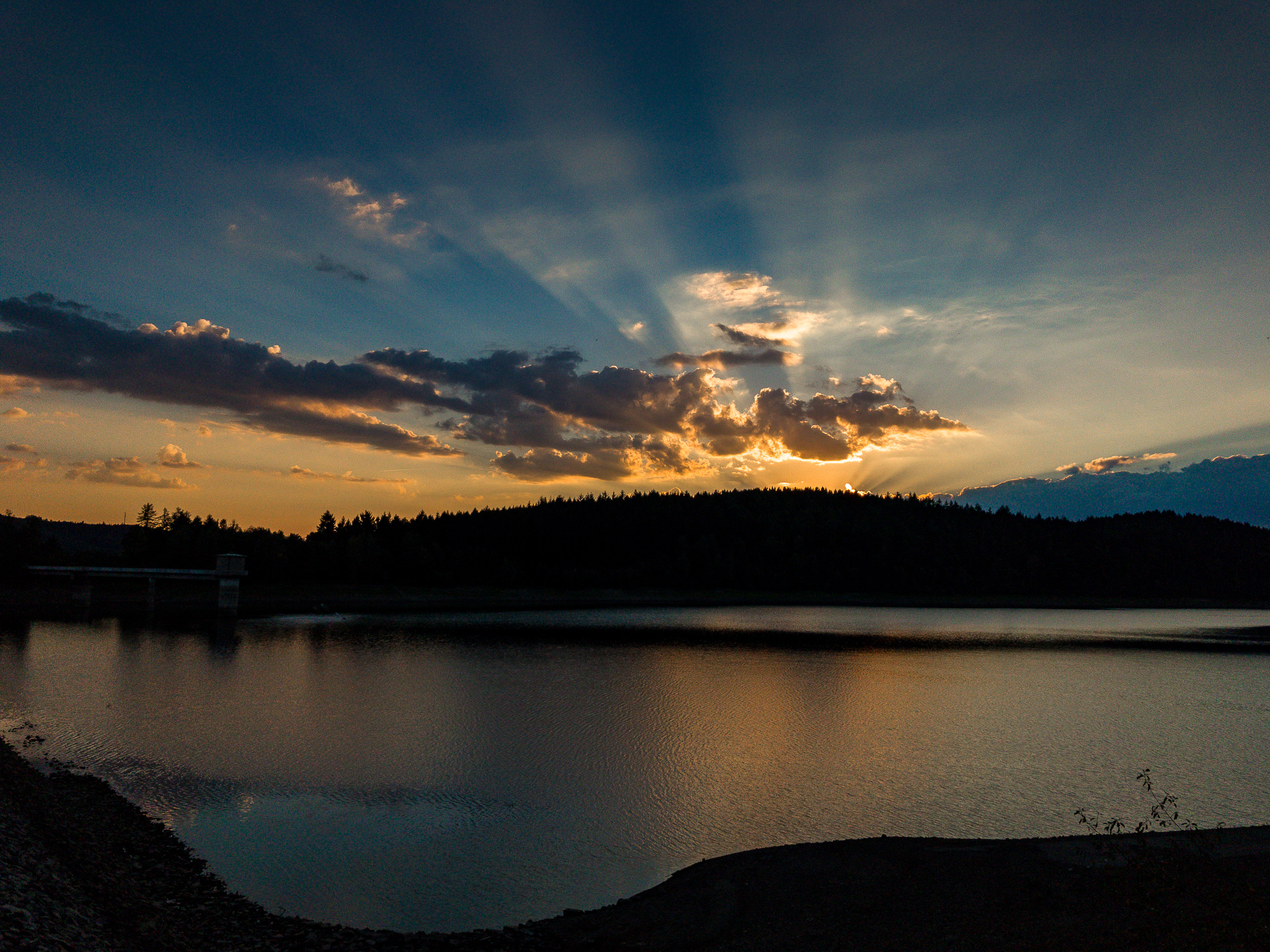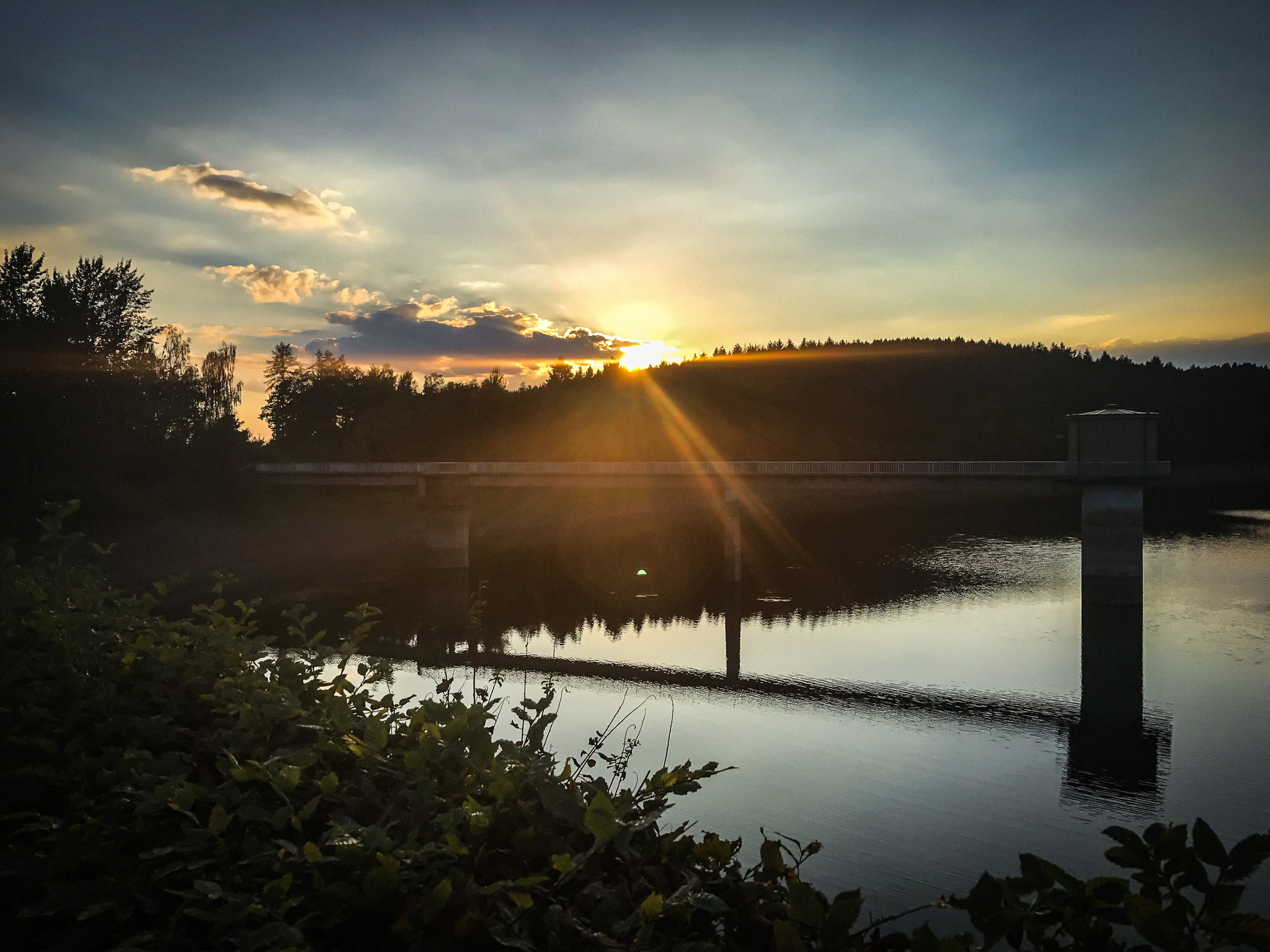 Die Sonne kurz vor dem Abtauchen war und trotz leichter Knieschmerzen lief ich bis zur 500m Marke und kam so auf 10,26km. Einfach herrlich, und ich hätte bei Problemen leichter abbrechen können. Nächstes mal gibt es bei guter Stimmung zwei richtige Runden. Konditionell fühle ich mich auch immer noch prima, eher die Beine bremsten mich vor einem weiteren Lauf über den Staudamm. Aber dafür habe ich ein paar nette Fotos gemacht…