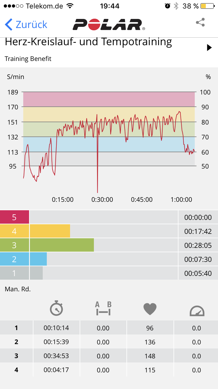 „Gigi mit L’Amour TouJours“ (Spotify Link) und es scheint, als ob ein innerer Mechanismus den Turbo reingehauen hätte. Schmerzen in den Beinen, der ganze Körper brennt und trotzdem motiviert die Musik und treibt mächtig an. Man kann schon fast von Lust reden, ein Automatismus spult das letzte Drittel des Training wie im Schnellvorlauf ab. Nebenbei höre ich die Polar M400 den Puls über 160 signalisieren und zeitgleich trommeln meine Füße die letzten Jumps in den Boden.