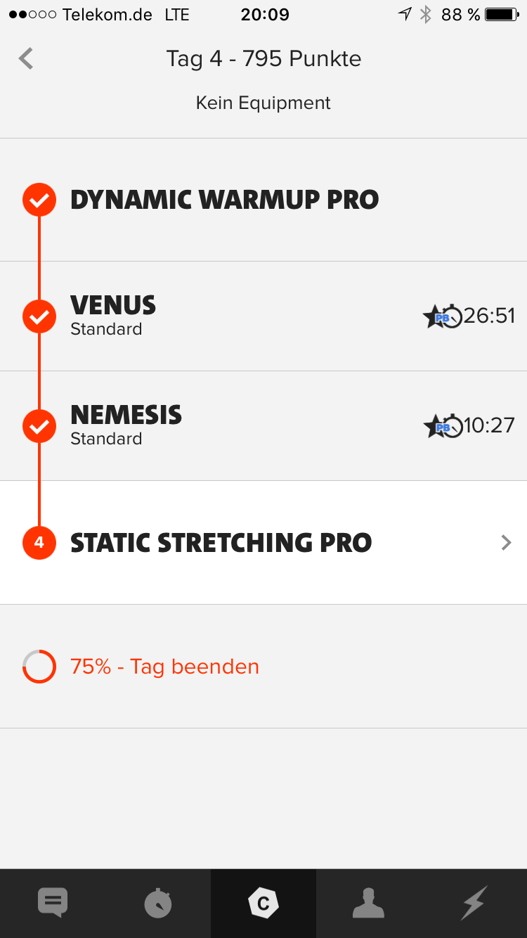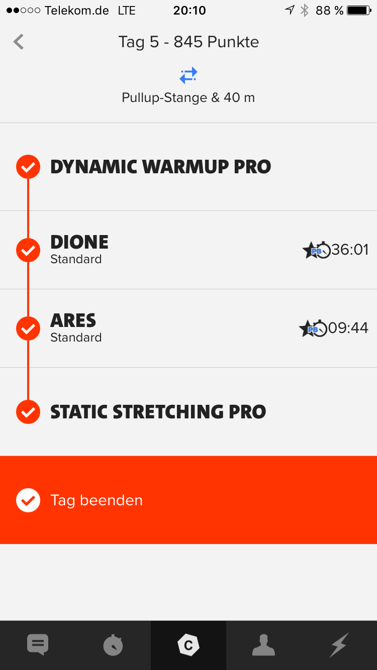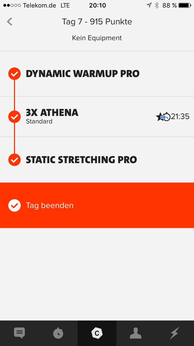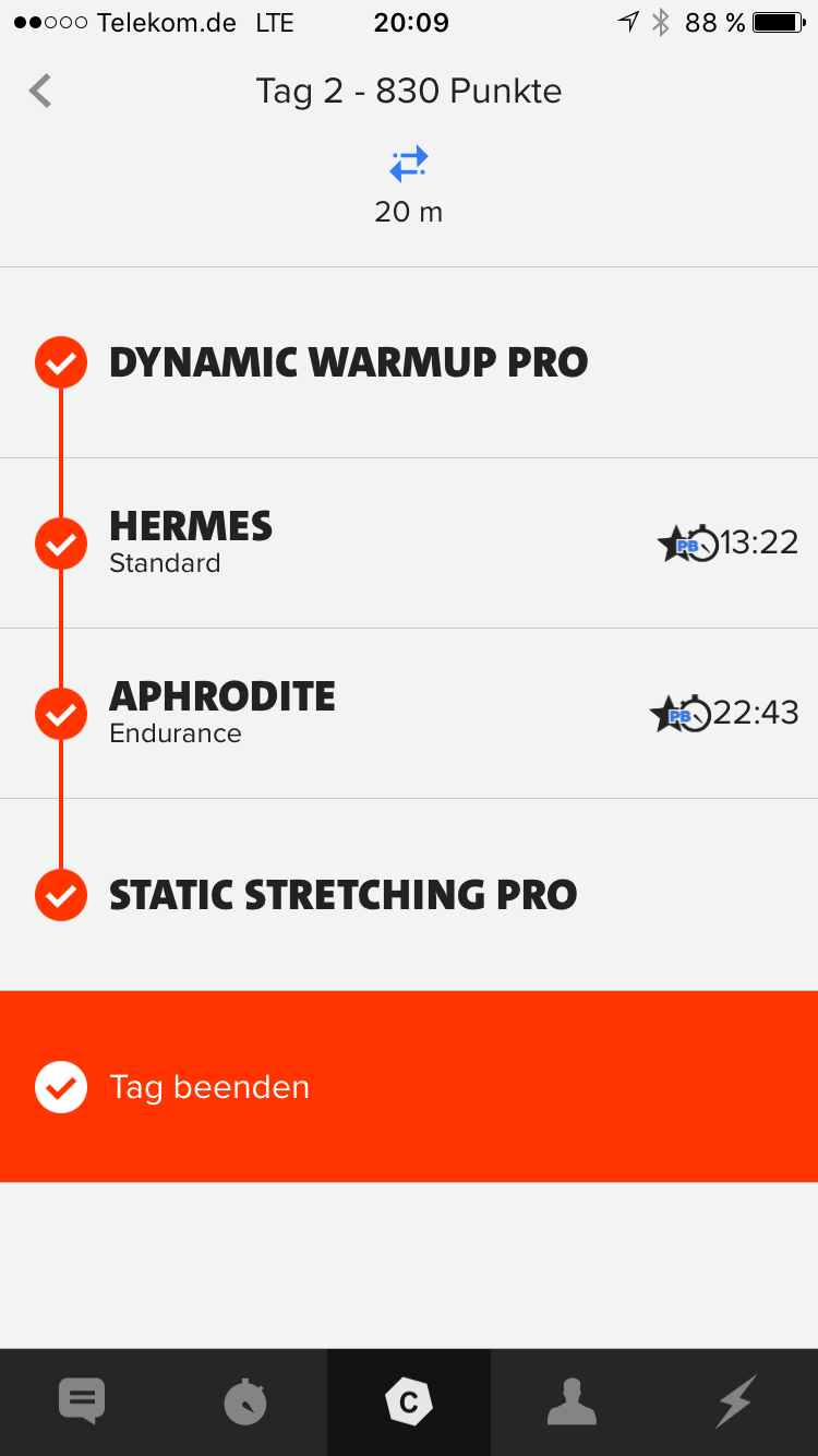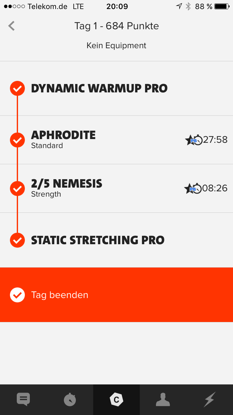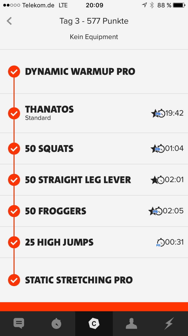 Zum Vergleich: Ein Training hat je nach Intensität und PB/ Stern 300-800 Punkte. Wenn man im Schnitt in einer normalen Woche 4x 600 Punkte erzielt, so hat man in der HellWeek fast das drei-vierfache einer normalen 4-Tage Woche geleistet.