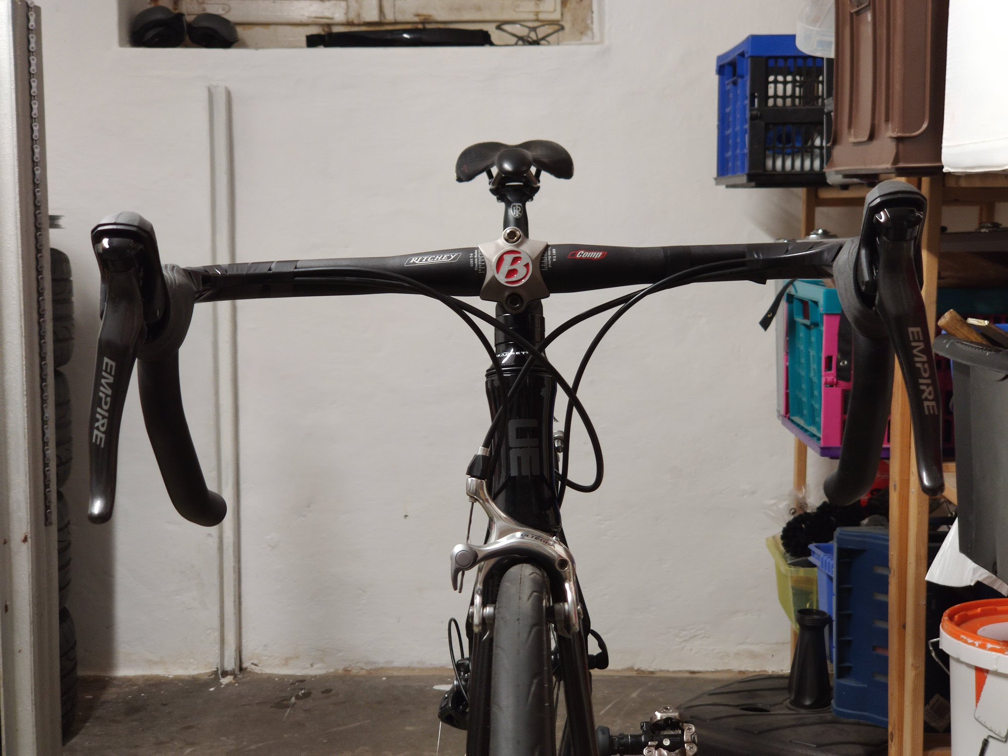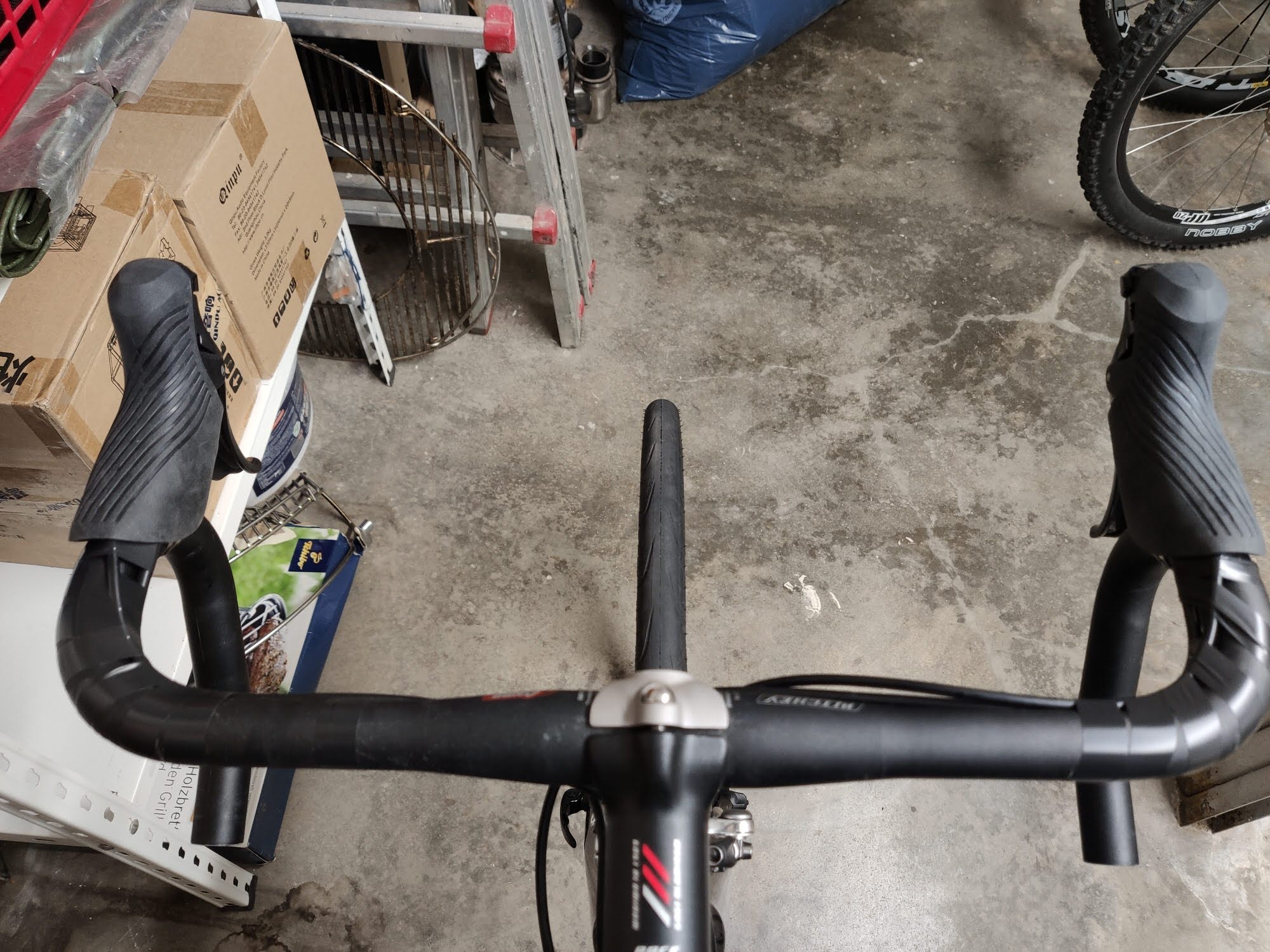Ratzfatz war das Lenkerband runter (nicht geklebt, war neu) und die alte Ultegra demontiert. Zwischenzeitlich, wieder vom Online-Bike Versand, waren neue Schalt- und Bremszüge eingetrudelt. Einmal weil die Alten halt alt sind sind, und zudem auch zu kurz, da die Züge jetzt versteckt laufen. Also keine Wäscheleine wie bei den alten Ultegra STI.